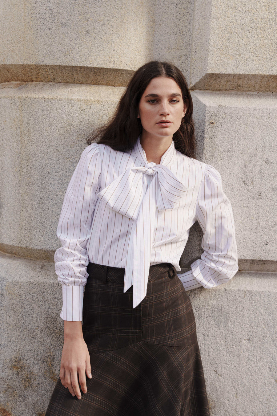 Camisa de manga larga blanca en tejido estampado de mil rayas chocolate 100% algodón. Cierre delantero con botones. Cuello con lazada.