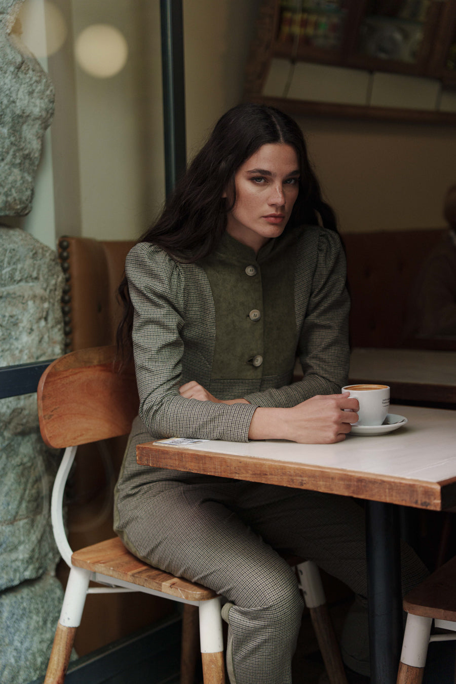 Chaqueta austriaca tipo cropped con cierre delantero de botones y volumen en manga en estampado de cuadros verdes y detalle de pechera en micropana verde
