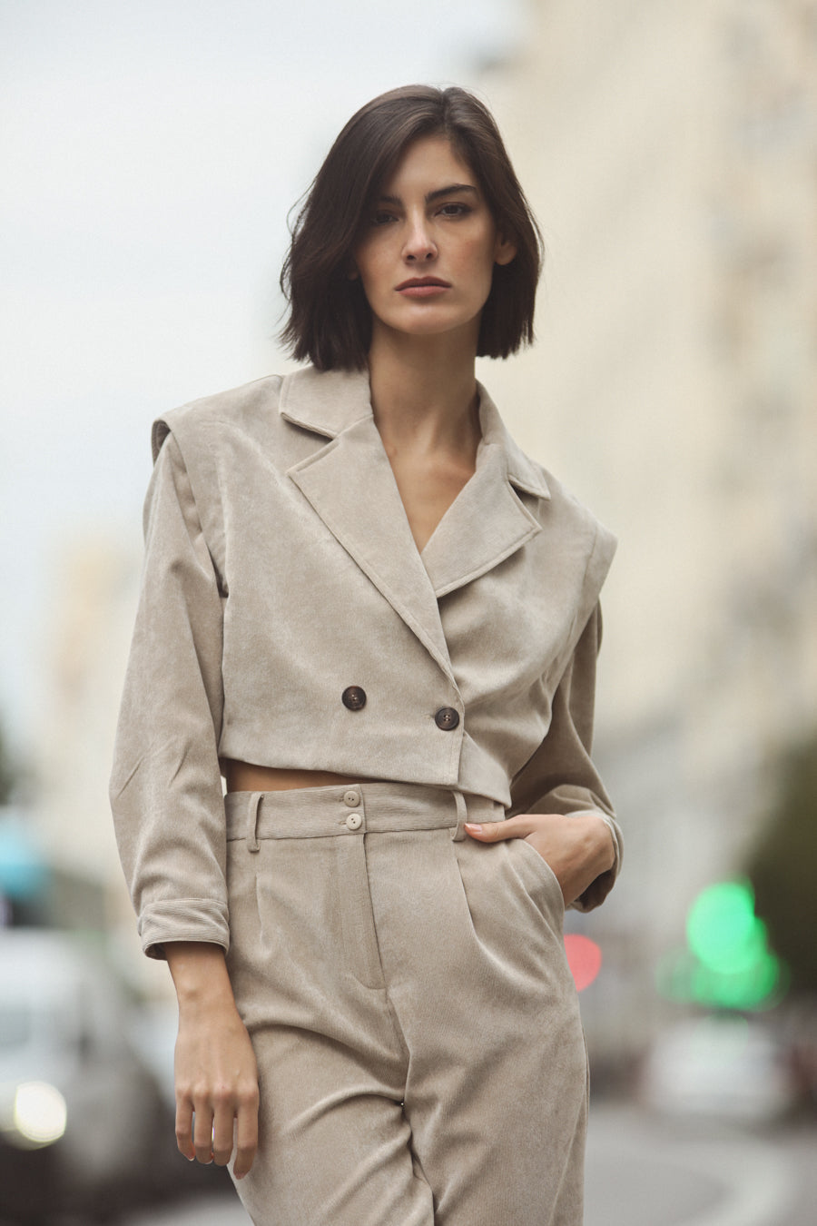 Chaqueta tipo cropped de mangas desmontables con cierre delantero de botones en tejido de pana.