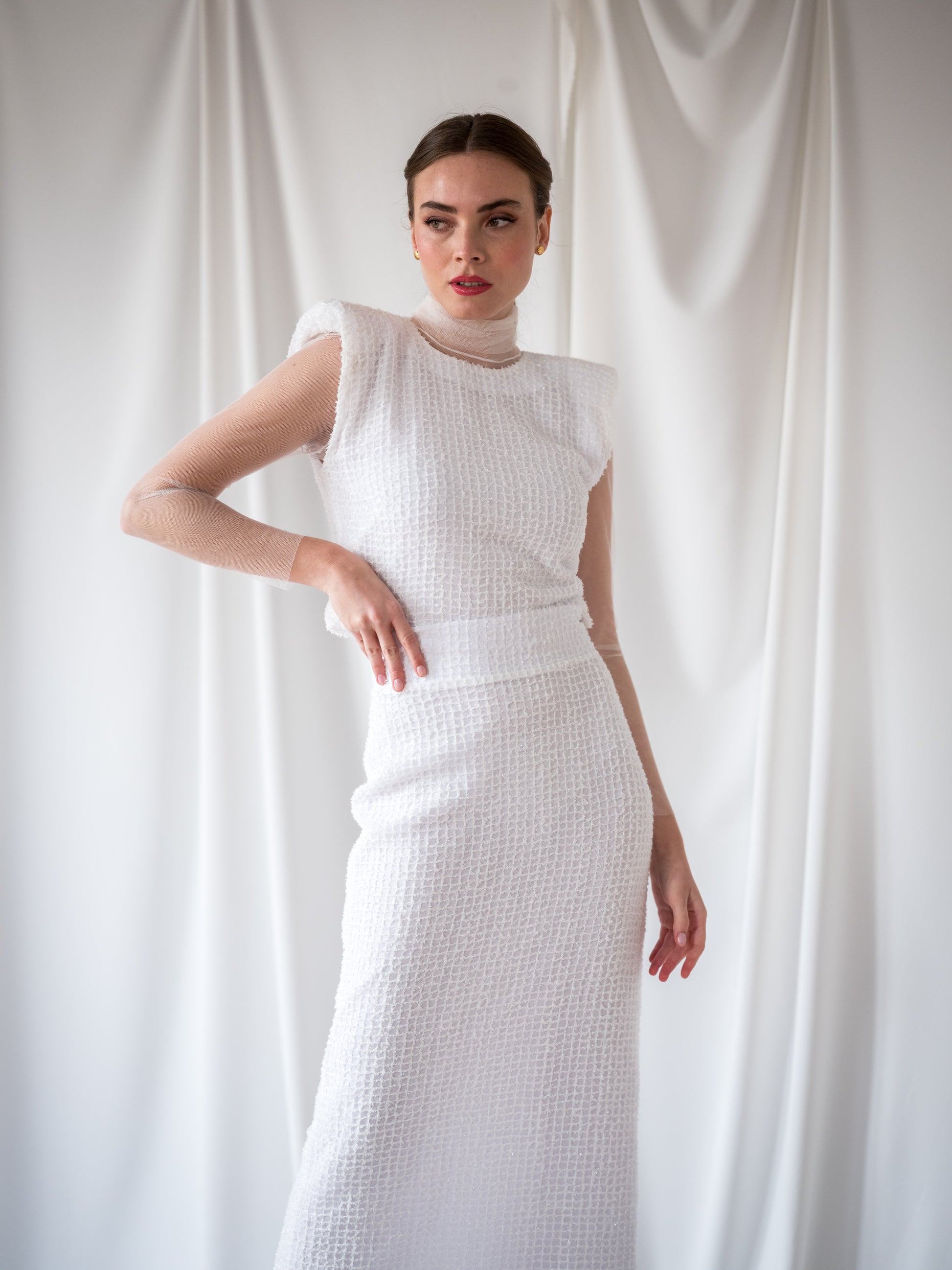 Conjunto confeccionado en tejido de lúrex texturizado y forro a tono de punto.