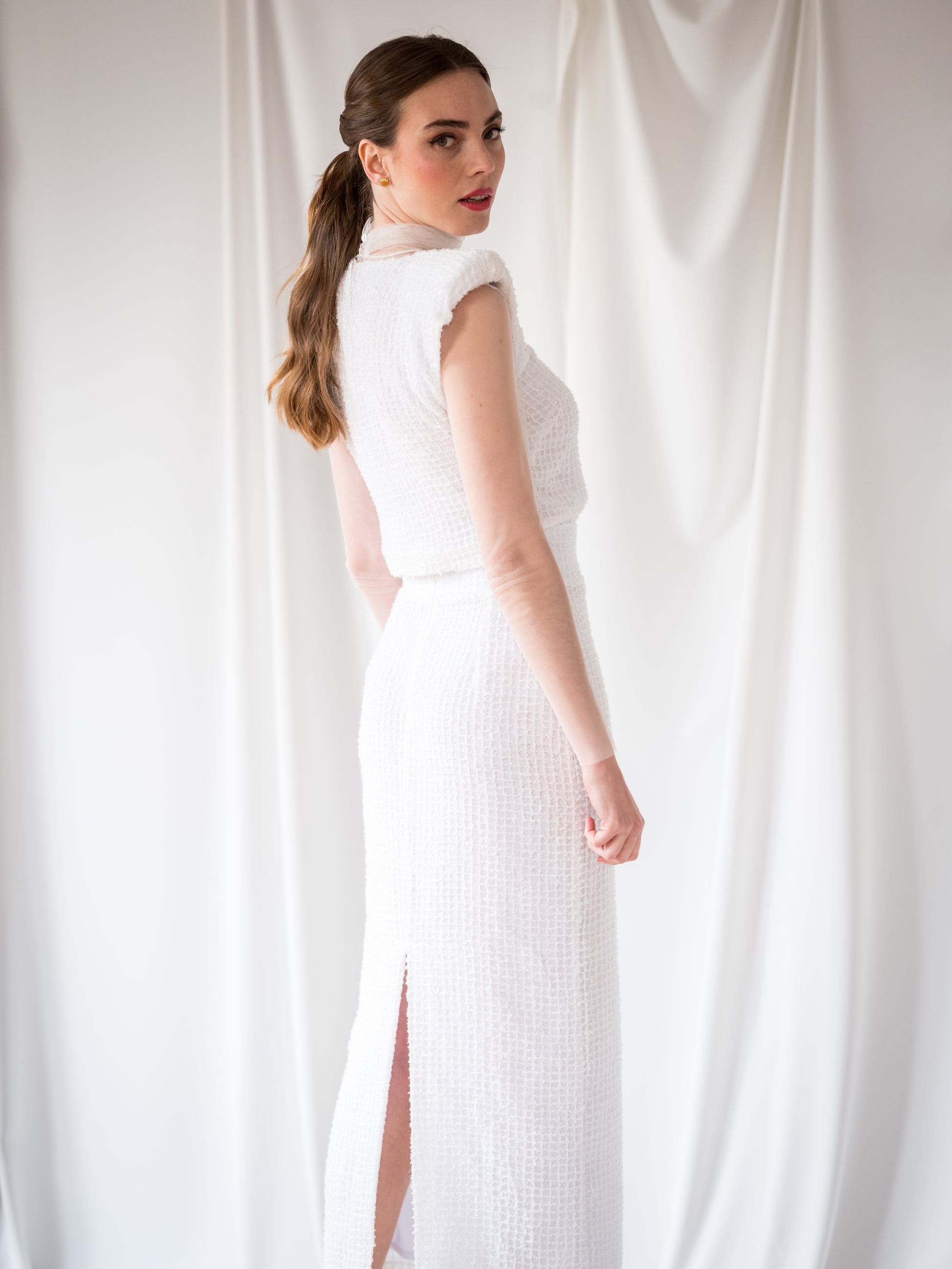El Conjunto Cabernet lo componen un top tipo cropped con hombreras de 3 centímetros y lágrima con botón en espalda para cierre y una falda tubo de corte midi con cierre de cremallera a tono oculta en costura de centro espalda.