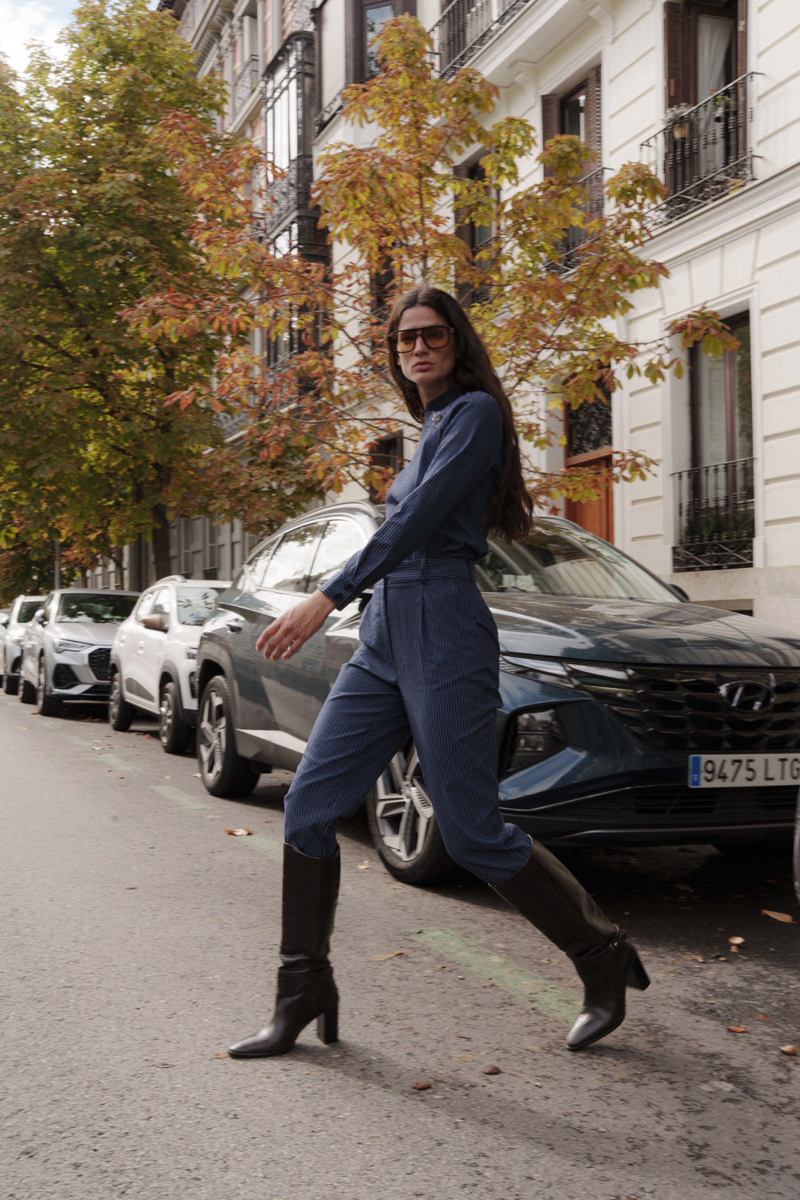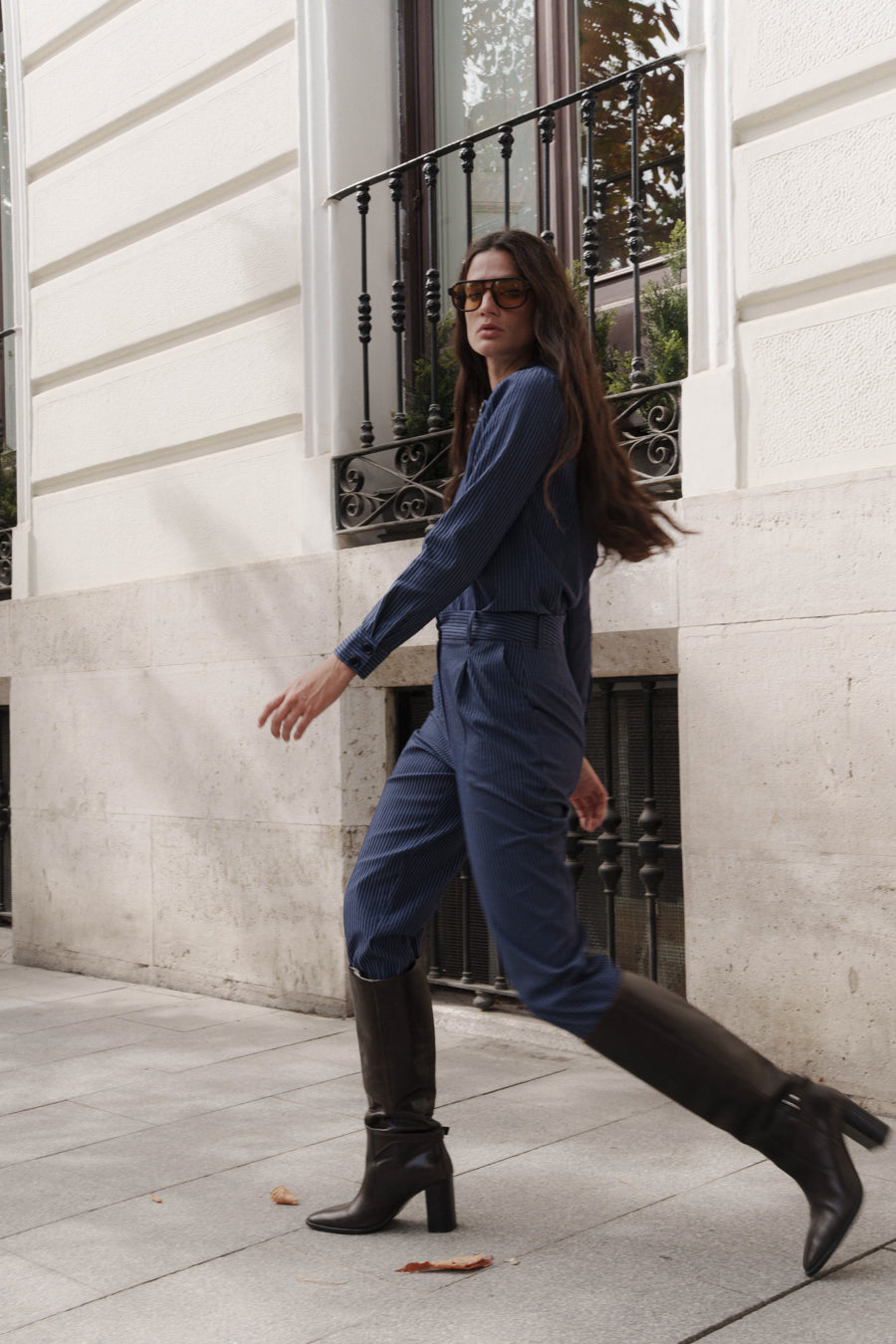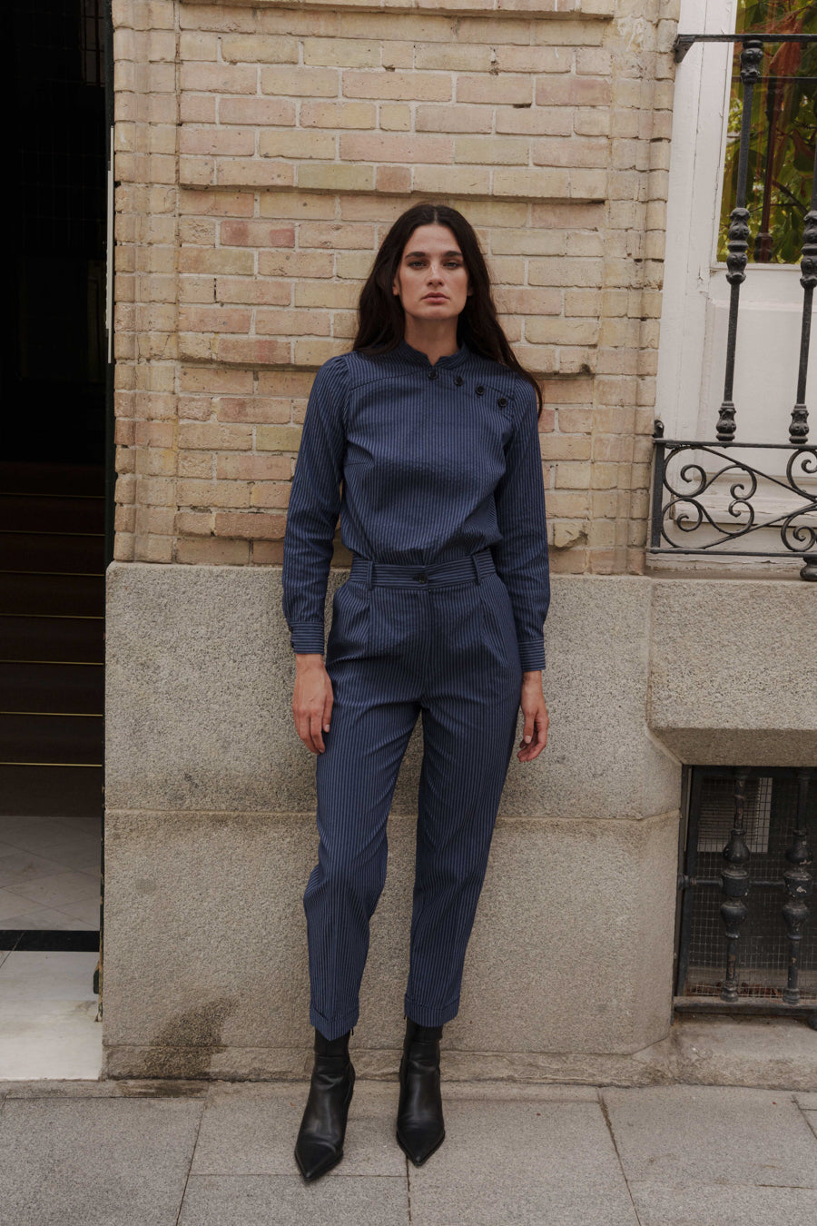 Pantalón tipo baggy con bolsillos delanteros en tono azul marino. El cierre es central en la parte delantera con cremallera y un botón.