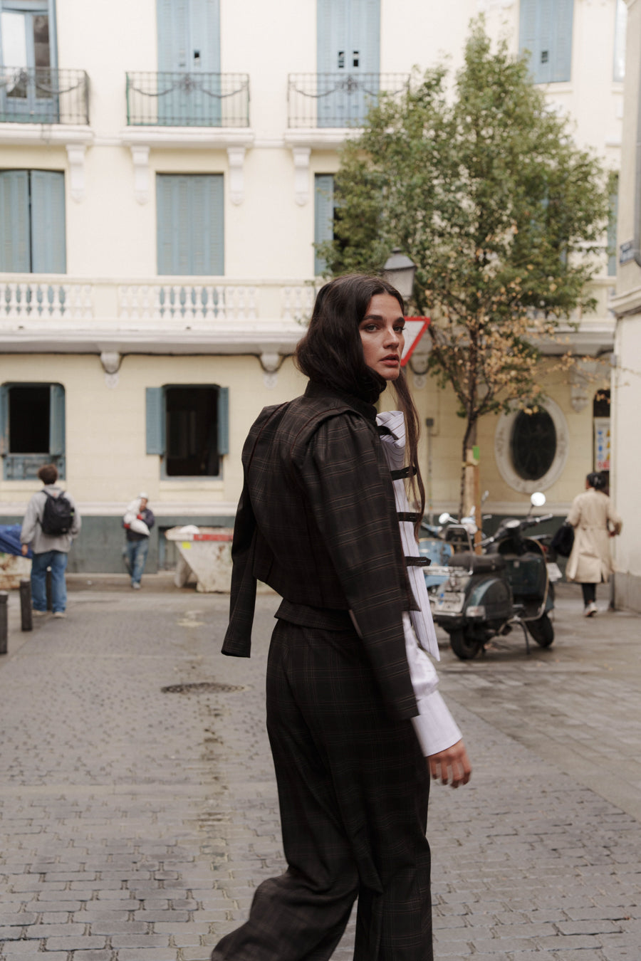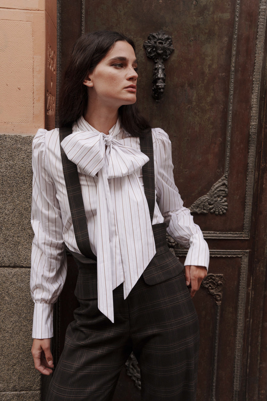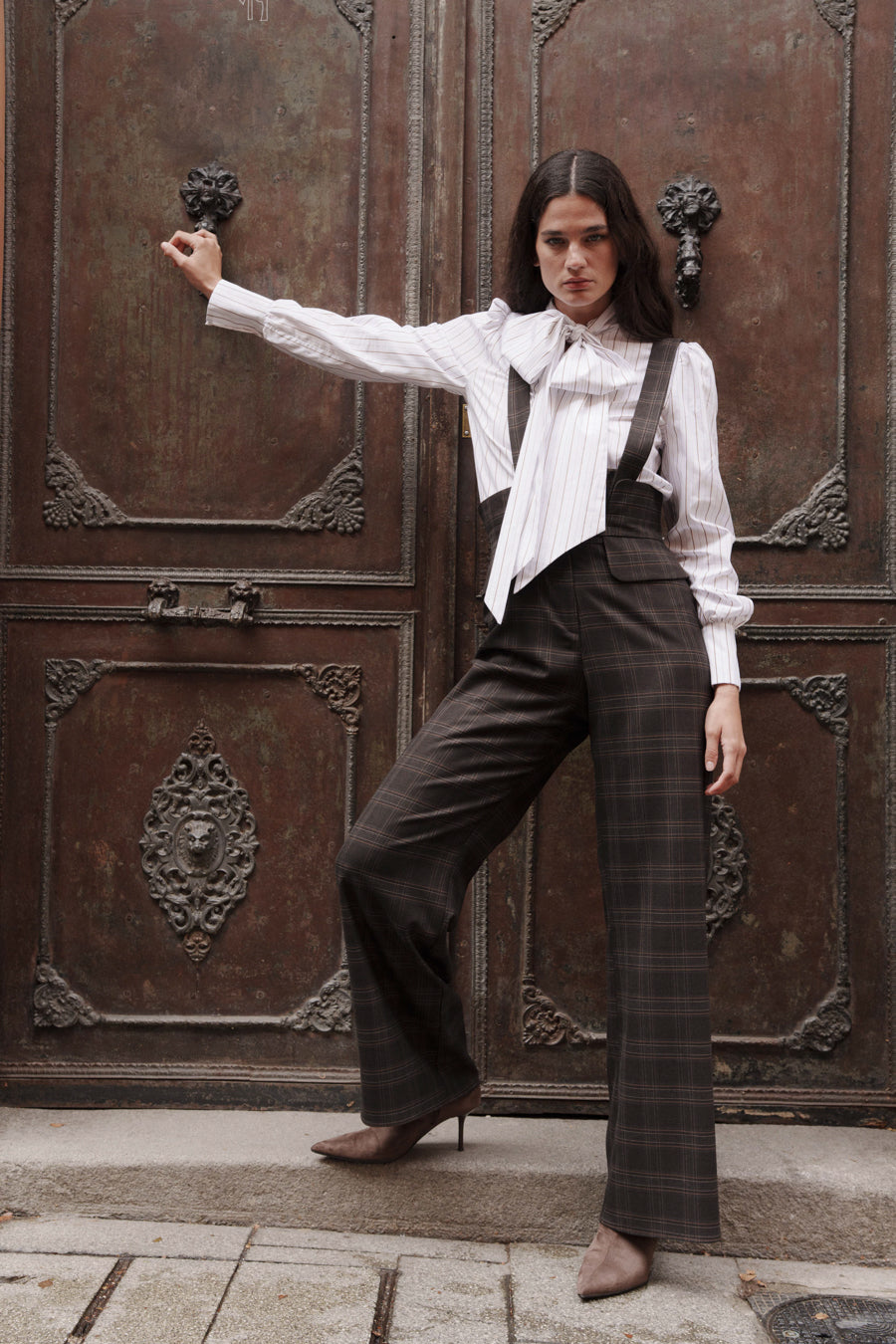 Peto de tirantes desmontables y pernera ancha en estampado de cuadros marrones.