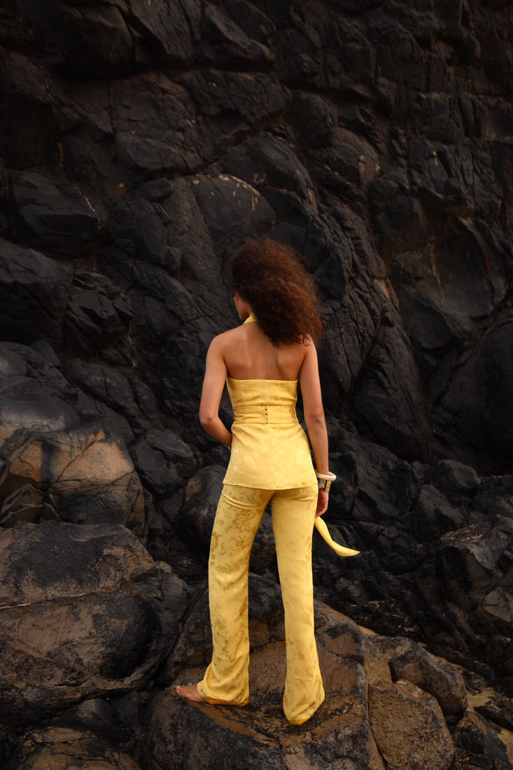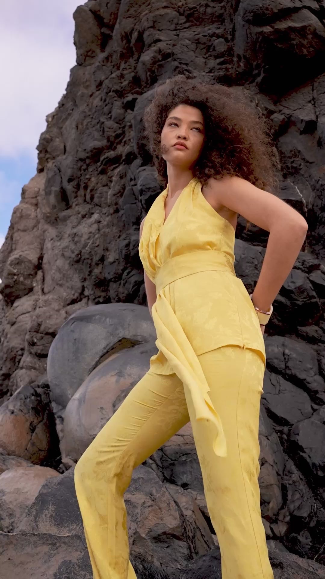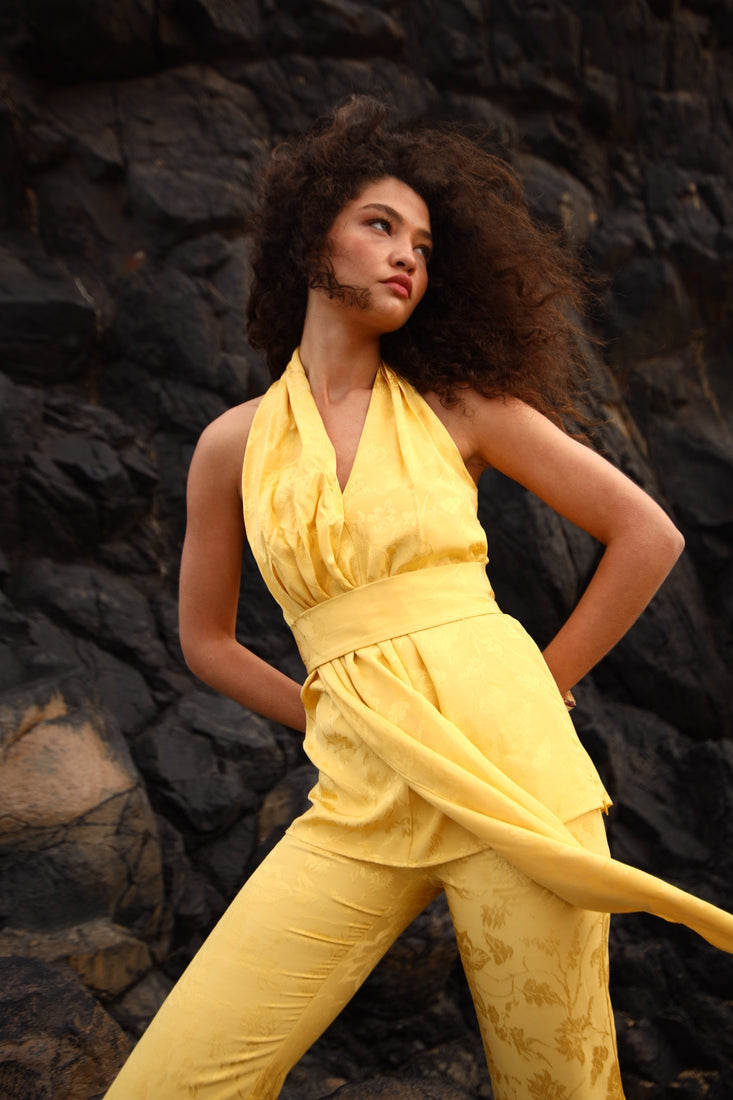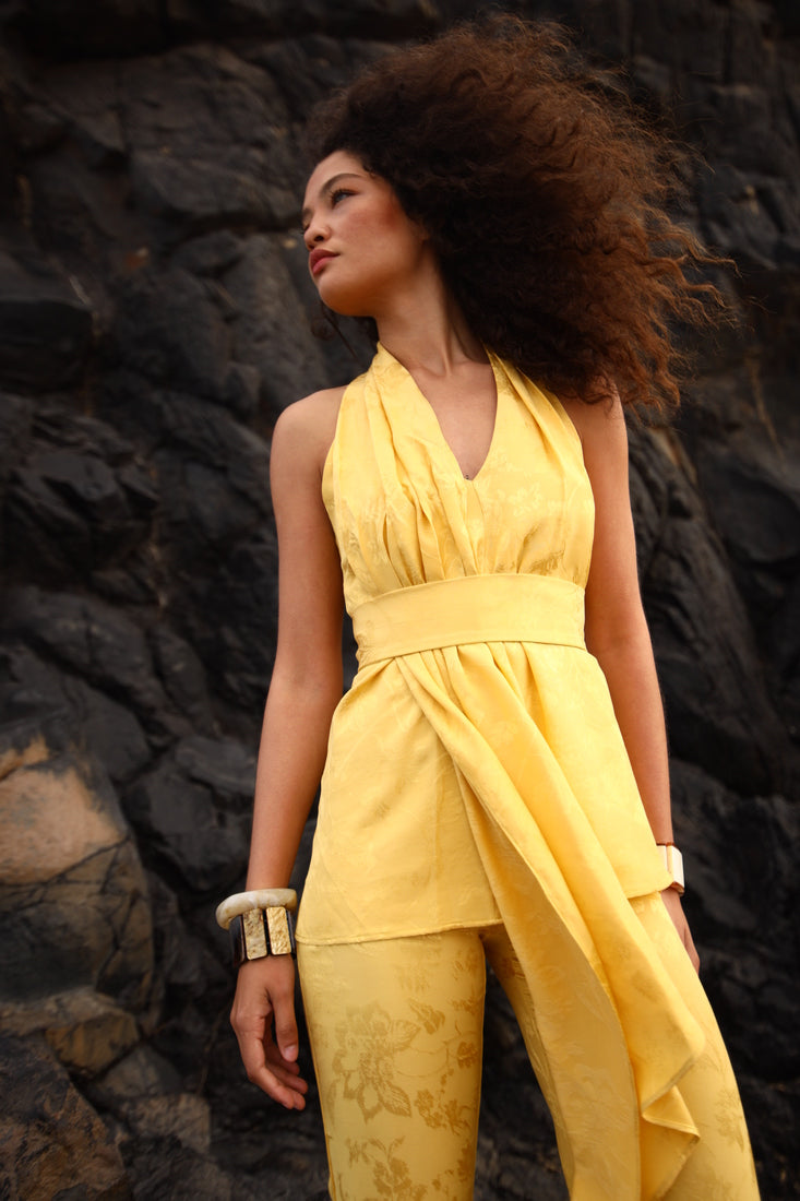 El top ‘Gia’, de tipo halter, posee un pañuelo multiposición y cierre en cuello con