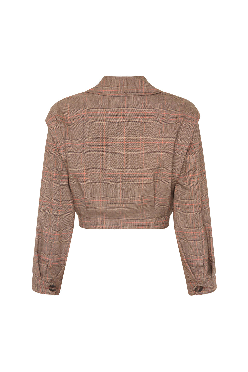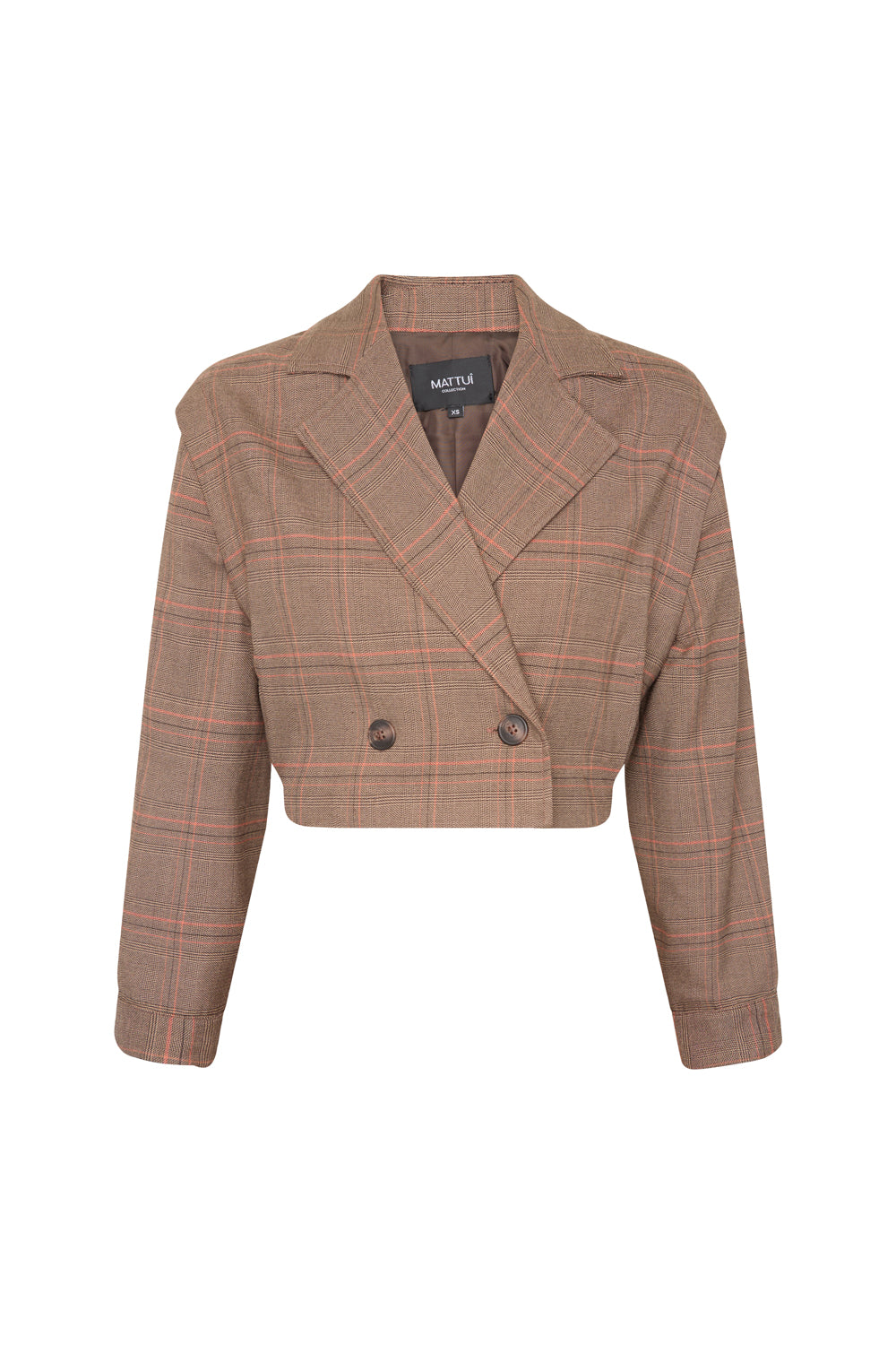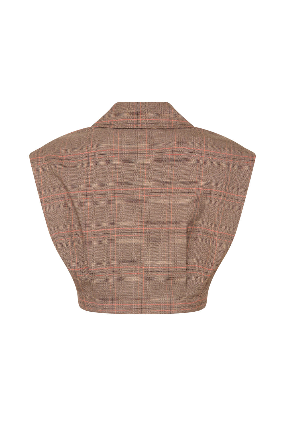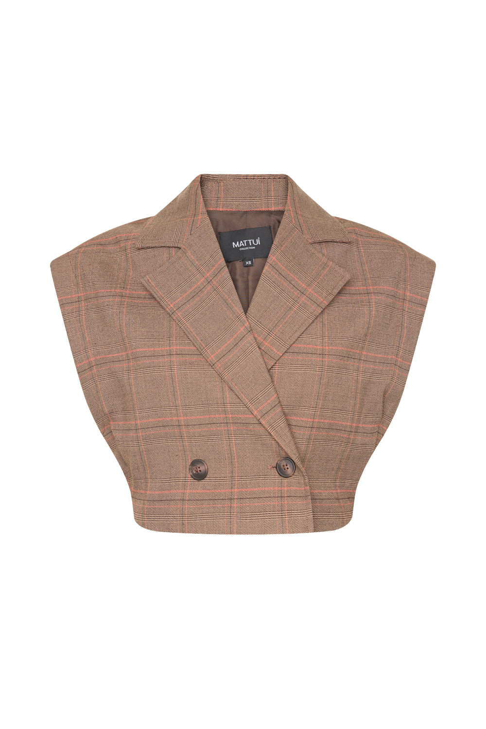 Chaqueta tipo cropped de mangas desmontables con cierre delantero de botones.