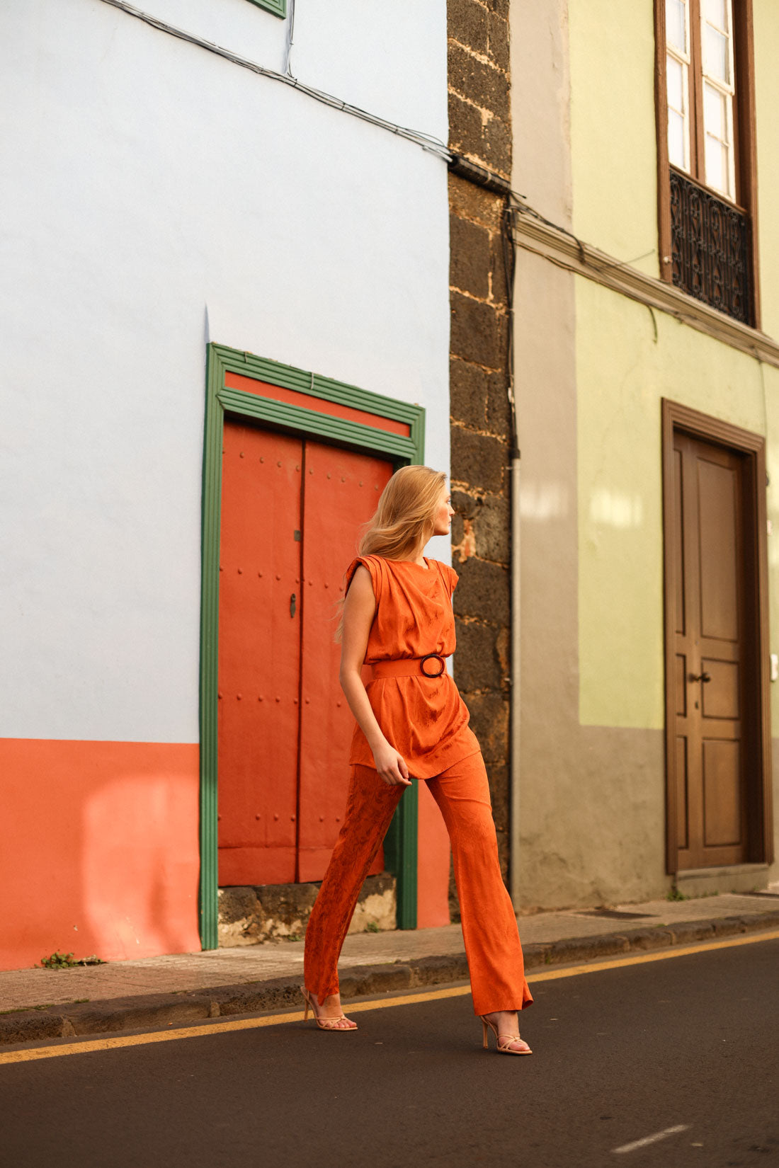 cinturón a juego de 5cm de ancho y hebilla de carey. El cierre del top se encuentra en la costura de centro espalda gracias a una cremallera oculta a tono.