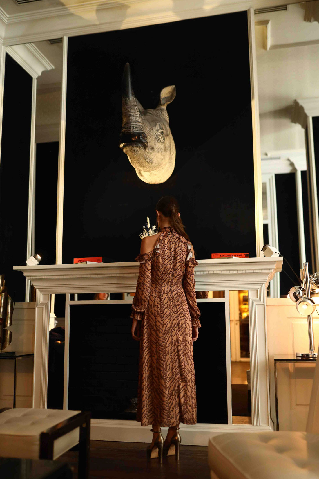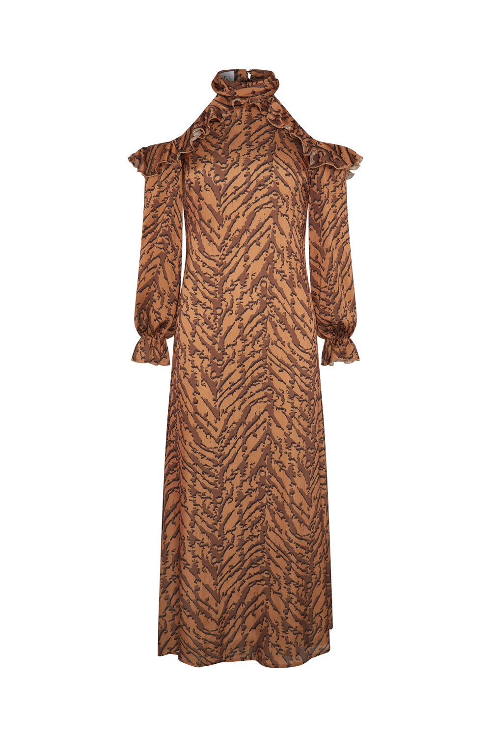 El Vestido Dominique es uno de los más bonitos de la colección. Con un estampado de lo más tendencia que utiliza el "animal print" y hombros descubiertos enmarcados con un precioso volante, con el Vestido Dominique te sentirás más especial que nunca. Su corte es midi.